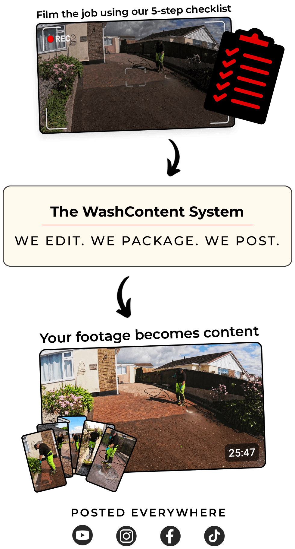 We cover this in detail during onboarding and provide direct links to our WashContent Filming Kit, so you know exactly what to get — and what you don’t need.
